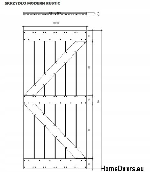 Drzwi o konstrukcji deskowej oklejone naturalnym fornirem. Krawędzie desek zdobi drewno naturalne wybranych gatunków. Drzwi wykończone bezpiecznym dla zdrowia i otoczenia, matowym olejem bezbarwnym, o wysokiej odporności na ścieranie. Skrzydło z jednej strony jest gładkie.