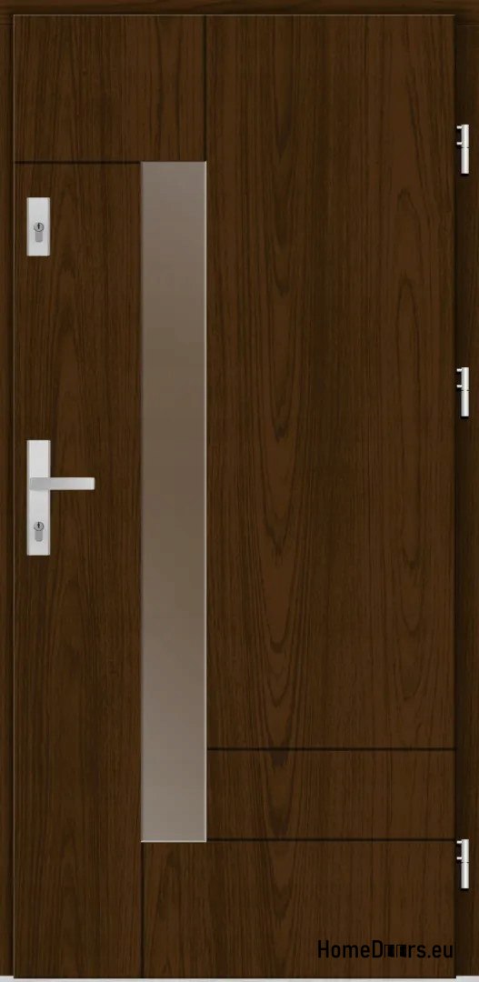 Bezpieczeństwo stoi tu na najwyższym poziomie – drzwom towarzyszą dwa niezależne zamki trzypunktowe, trzy regulowane zawiasy, zabezpieczenia antywyważeniowe oraz uszczelki w ościeżnicy i progu, które wspólnie skutecznie chronią przed hałasem i stratami ciepła. Rama stalowa i solidna konstrukcja ramowo‑płytowa dodatkowo zwiększają trwałość i sztywność skrzydła.