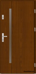 Pokrycie skrzydła to płyta wodoodporna fornirowana, co gwarantuje trwałość i odporność na działanie niekorzystnych warunków atmosferycznych. Drzwi dostępne są w różnych kolorach, takich jak antracyt, orzech, złoty dąb czy ciemny dąb, co pozwala na dopasowanie ich do stylu budynku.
