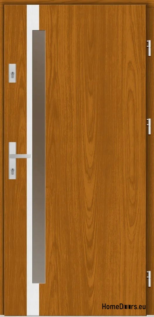 Z zewnątrz drzwi pokryte są wodoodporną płytą fornirowaną naturalnym drewnem, co nie tylko nadaje im elegancki wygląd, ale także zapewnia odporność na warunki atmosferyczne. Wnętrze wypełnione jest płytą termoizolacyjną o grubości 60 mm, co przekłada się na doskonałą izolację cieplną i akustyczną – współczynnik przenikania ciepła wynosi około 1,2 W/m²·K.