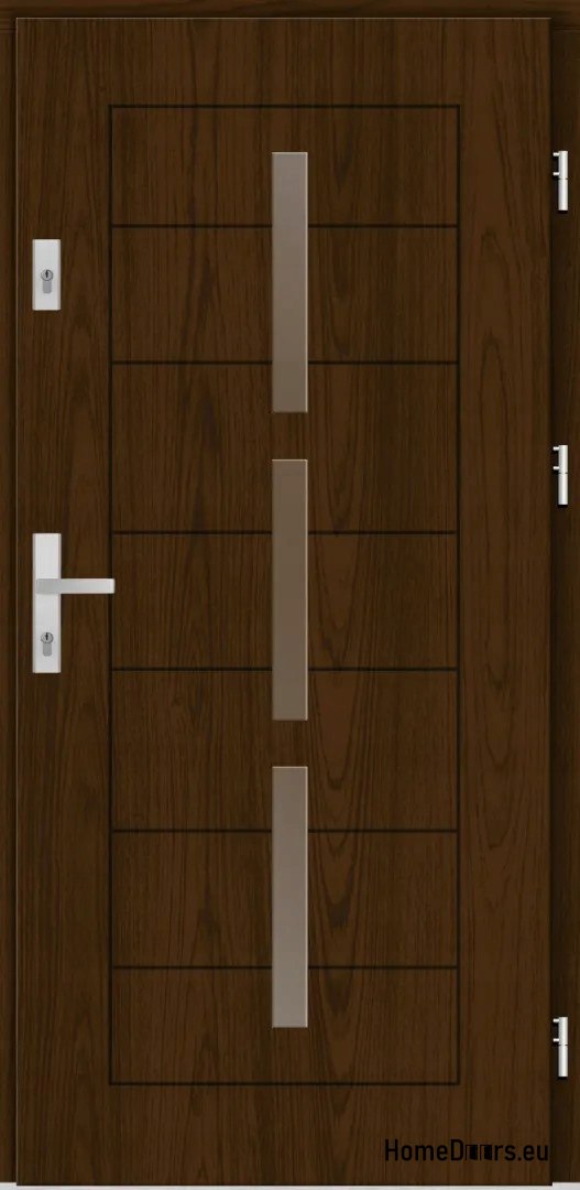 Z zewnątrz drzwi pokryte są wodoodporną płytą fornirowaną naturalnym drewnem, co nie tylko nadaje im elegancki wygląd, ale także zapewnia odporność na warunki atmosferyczne. Wnętrze wypełnione jest płytą termoizolacyjną o grubości 60 mm, co przekłada się na doskonałą izolację cieplną i akustyczną – współczynnik przenikania ciepła wynosi około 1,2 W/m²·K.