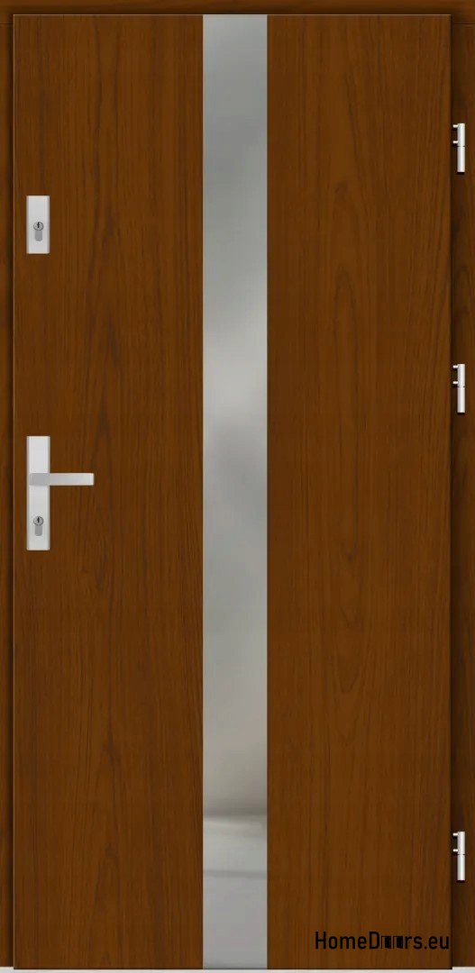 Z zewnątrz drzwi pokryte są wodoodporną płytą fornirowaną naturalnym drewnem, co nie tylko nadaje im elegancki wygląd, ale także zapewnia odporność na warunki atmosferyczne. Wnętrze wypełnione jest płytą termoizolacyjną o grubości 60 mm, co przekłada się na doskonałą izolację cieplną i akustyczną – współczynnik przenikania ciepła wynosi około 1,2 W/m²·K.