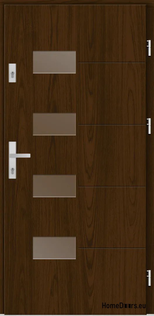 Z zewnątrz drzwi pokryte są wodoodporną płytą fornirowaną naturalnym drewnem, co nie tylko nadaje im elegancki wygląd, ale także zapewnia odporność na warunki atmosferyczne. Wnętrze wypełnione jest płytą termoizolacyjną o grubości 60 mm, co przekłada się na doskonałą izolację cieplną i akustyczną – współczynnik przenikania ciepła wynosi około 1,2 W/m²·K.