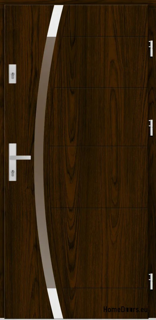 Z zewnątrz drzwi pokryte są wodoodporną płytą fornirowaną naturalnym drewnem, co nie tylko nadaje im elegancki wygląd, ale także zapewnia odporność na warunki atmosferyczne. Wnętrze wypełnione jest płytą termoizolacyjną o grubości 60 mm, co przekłada się na doskonałą izolację cieplną i akustyczną – współczynnik przenikania ciepła wynosi około 1,2 W/m²·K.