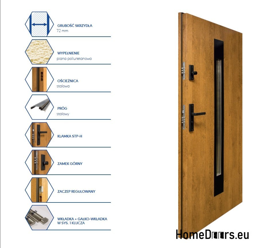 - Szerokość:110 cm (80 + 30 skrzydło bierne), wymiar z ościeżnicą 1210 x 2075 mm