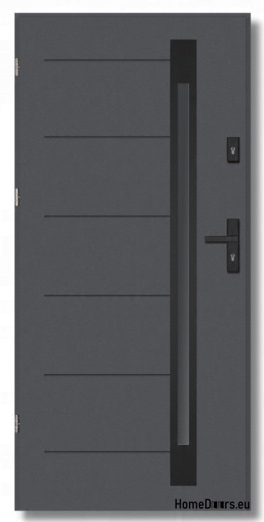 W modelu zastosowano wielokomorowe przeszklenie antisol DEEP-BLACK, które nie tylko nadaje drzwiom nowoczesnego wyglądu, ale też ogranicza wgląd do wnętrza, poprawiając prywatność. Szyby są osadzone w czarnej, stalowej ramce lakierowanej proszkowo w kolorze NERO.