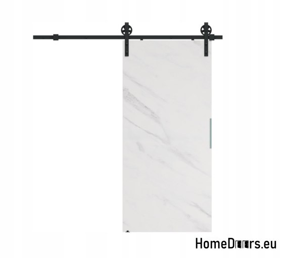 W zestawie otrzymujesz kompletne drzwi przesuwne 85 cm – skrzydło w kolorze Marmuru Białego + czarny system przesuwny LOFT A-04 + uchwyt i prowadniki.